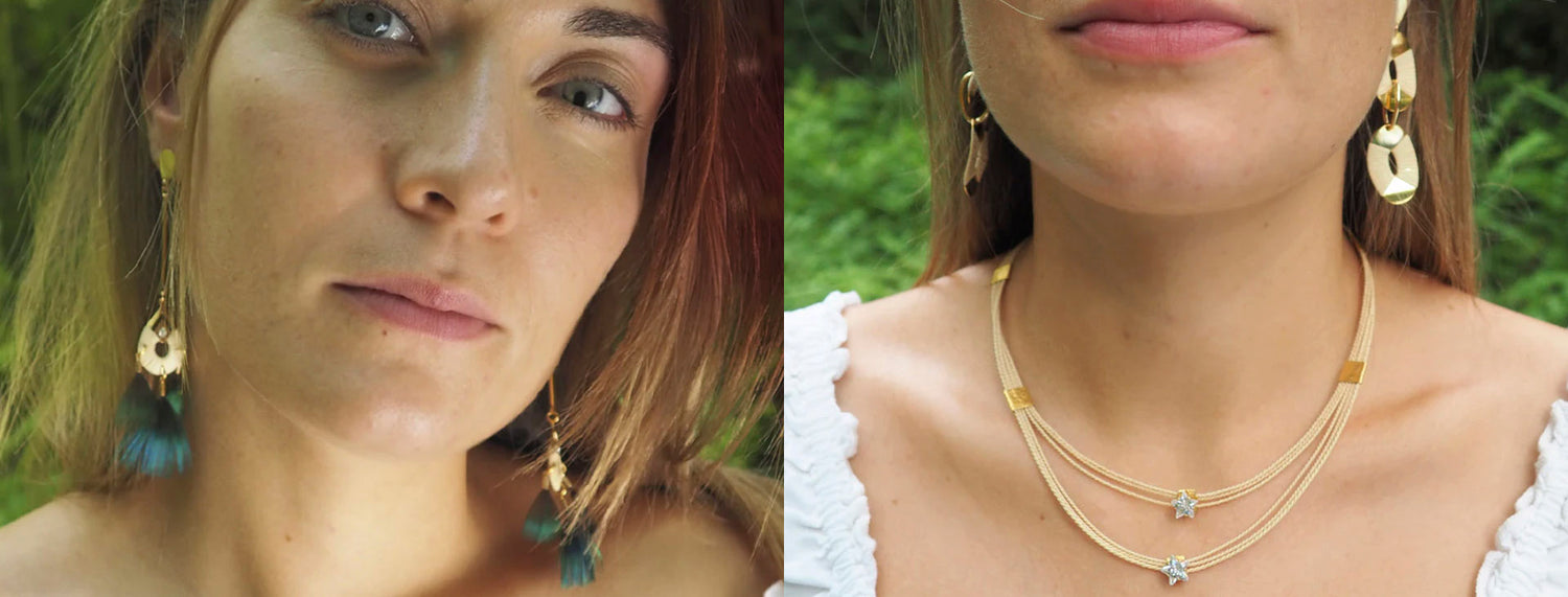 Las joyas son confeccionadas en oro vegetal, seda de buriti, piedras naturales, semillas y latón libre de níquel y bañado a oro 18k, por lo tanto son bio sostenibles y hipoalergénicas.