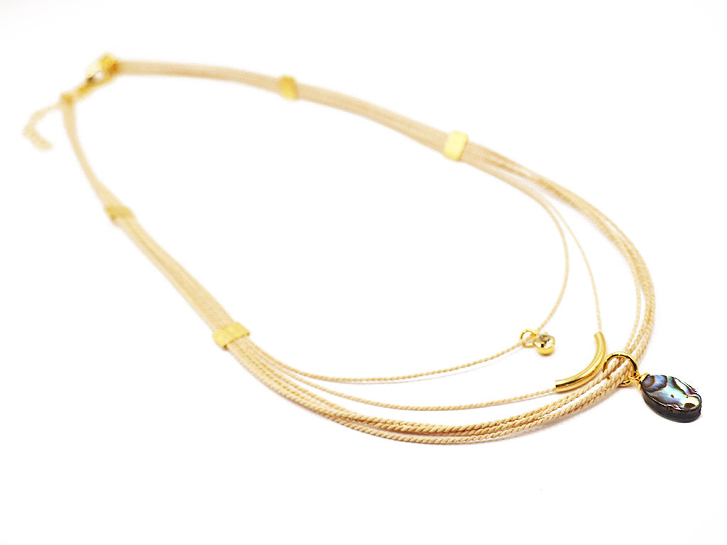 Elegant 3-strand necklace handmade in buriti silk and natural abalone stone, with details in 18k gold-plated brass metals, nickel-free.