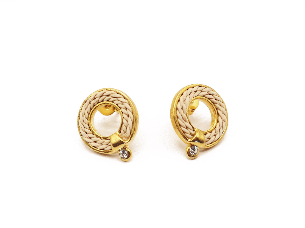 Pendientes en seda de buriti y zirconita con cierre en latón bañado en oro 18k, libre de níquel.