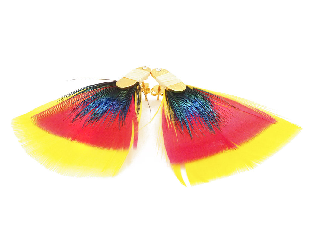 Pendientes plumas naturales pavo real, fucsia y amarillo